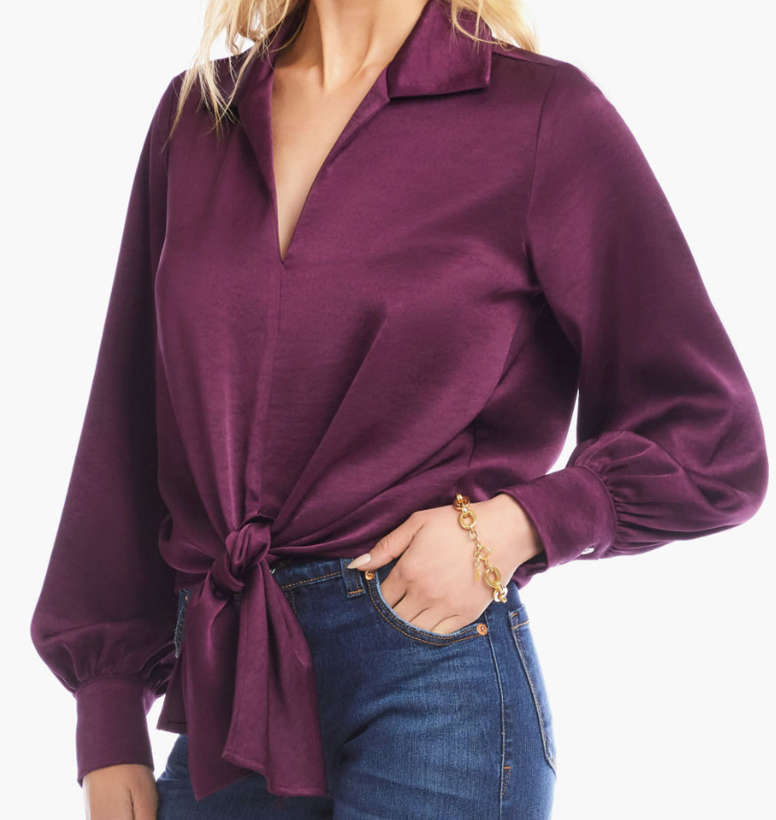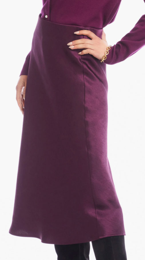 A bias-cut satin slip skirt is one of the most versatile pieces you can own, capable of transitioning from casual weekend wear to high-level office attire with ease. While it’s perfect for layering with knits or tees, it can be styled in many ways to suit more formal environments. Here is one more example of a more elegant look with this skirt: pair the eggplant Karen Kane Bias Cut Satin Midi Skirt with the matching Tie Front Satin Top. This monochromatic pairing creates a sleek ‘column of color’ that is the epitome of effortless, classy style.