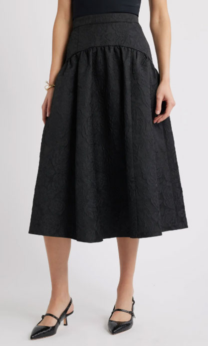 How to Create It: We’re building this look on a base of classic black. Use the Eileen Fisher Slim Fit Scoop Neck Silk Tank tucked into the Caslon Floral Jacquard Full Midi Skirt. The volume of the skirt creates a dramatic silhouette. Layer the Nordstrom Collarless Bouclé Jacket over your shoulders for a polished, Jackie O-inspired finish.